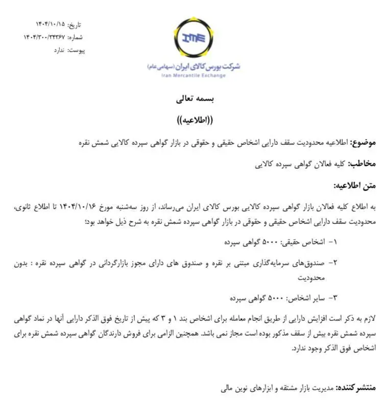 بورس کالای ایران با هدف مدیریت بازار نقره و کنترل حجم معاملات، از اعمال محدودیت جدید در خرید گواهی سپرده نقره برای اشخاص حقیقی و حقوقی خبر داد؛ محدودیتی که از ۱۶ دیماه اجرایی شده و سقف معاملات نقره را در بازارهای مالی بورس کالا مشخص میکند.