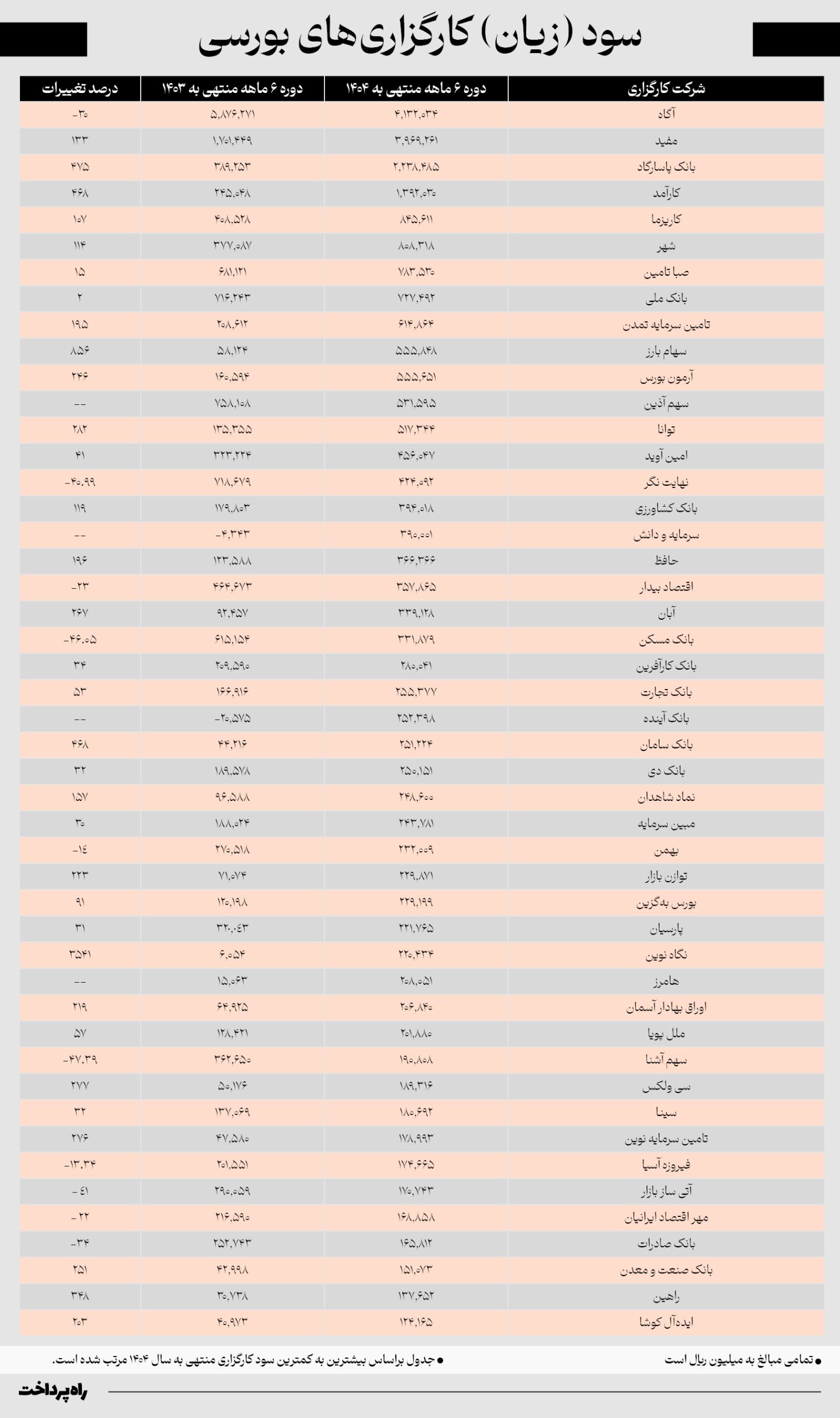 کارگزاری آگاه با ثبت ۴.۱۳۲.۰۳۴ میلیون ریال سود در ۶ ماهه ۱۴۰۴، در رتبه نخست قرار دارد، هرچند این رقم نسبت به سال گذشته ۳۰ درصد کاهش داشته است. در رتبههای بعدی، کارگزاری مفید با سود ۳.۹۶۹.۲۶۱ میلیون ریال و رشد ۱۳۳ درصدی و کارگزاری بانک پاسارگاد با سود ۲.۲۳۸.۴۸۵ میلیون ریال و رشد چشمگیر ۴۷۵ درصدی قرار گرفتهاند. همچنین کارگزاری کارآمد نیز با ثبت سود ۱.۳۹۲.۰۳۰ میلیون ریالی، رشد ۴۶۸ درصدی را نسبت به مدت مشابه سال قبل تجربه کرده است.