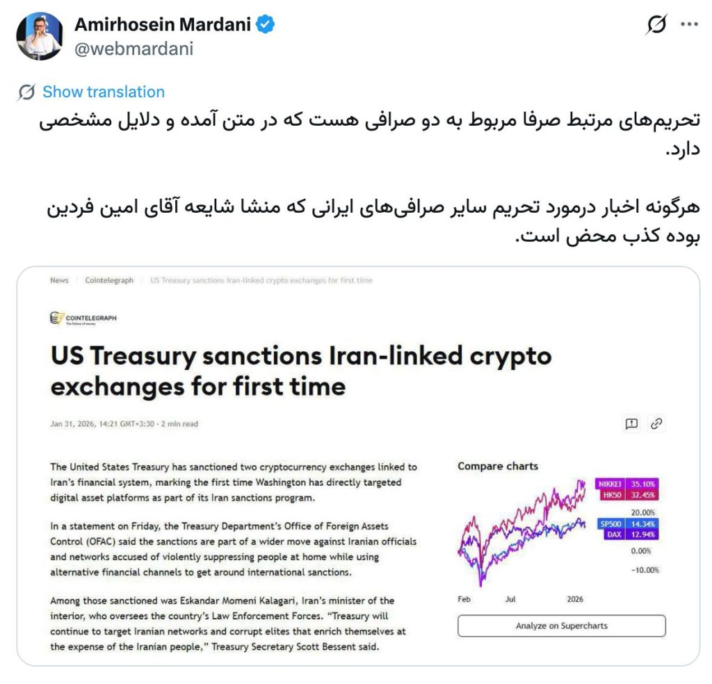 امیرحسین مردانی، همبنیانگذار صرافی بیتپین، نیز به شایعه تحریم گسترده صرافیهای ایرانی که باعث نگرانی کاربران شده بود، واکنش نشان داد و بیان کرد که این تحریمها صرفا در مورد دو صرافی ثبتشده در بریتانیا است.