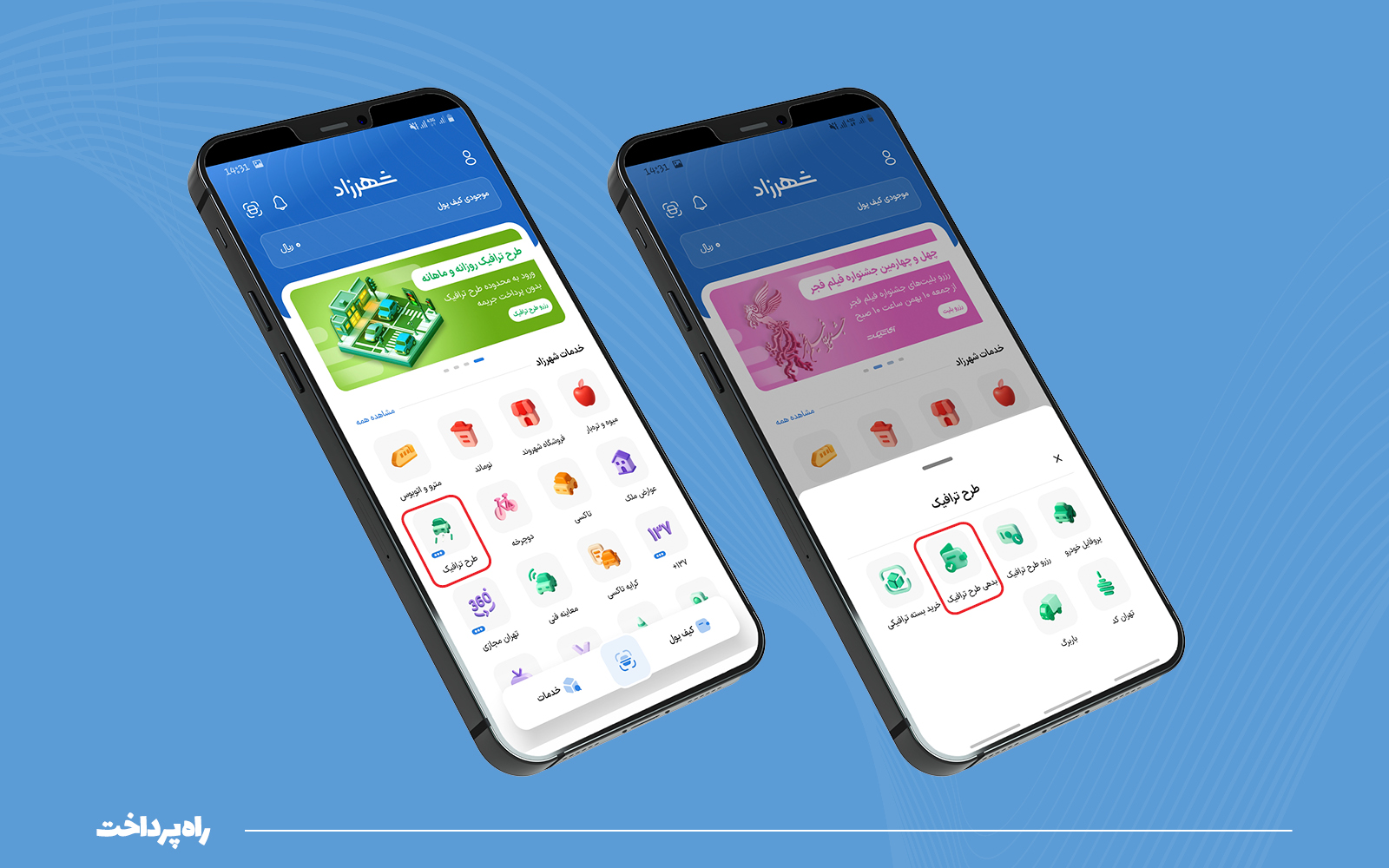با ورود به اپلیکیشن شهرزاد و انتخاب گزینه «طرح ترافیک»، سرویسهای مختلفی مانند «رزرو طرح ترافیک»، «بدهی طرح ترافیک» و «خرید بسته ترافیکی» نمایان میشود.