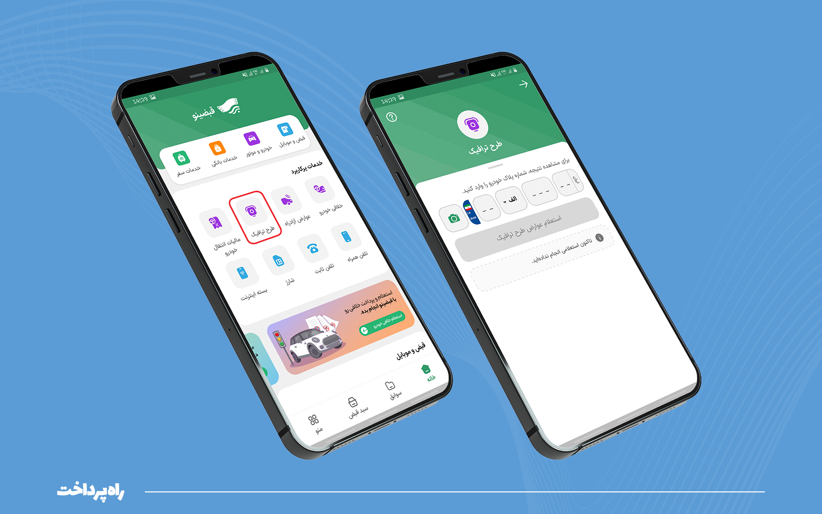برای استفاده از سرویس طرح ترافیک در اپلیکیشن قبضینو، با ورود با اپلیکیشن و انتخاب گزینه «طرح ترافیک» میتوان از این سرویس استفاده کرد.