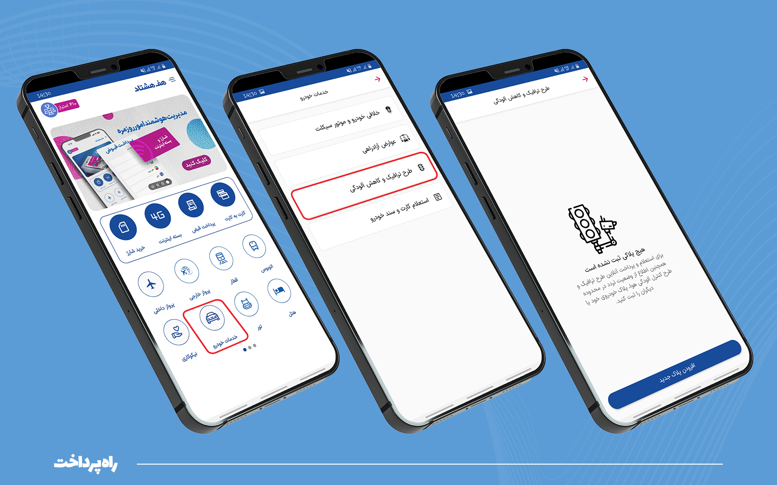 در ادامه از میان گزینههای نمایان شده، گزینه «طرح ترافیک و کاهش آلودگی» را انتخاب کرده و با وارد کردن پلاک خودرو میتوان فرایند استعلام و پرداخت آنلاین طرح ترافیک را کامل کرد.