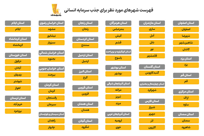 فهرست شهرهای مورد نظر جهت جذب سرمایه انسانی به صورت زیر است: