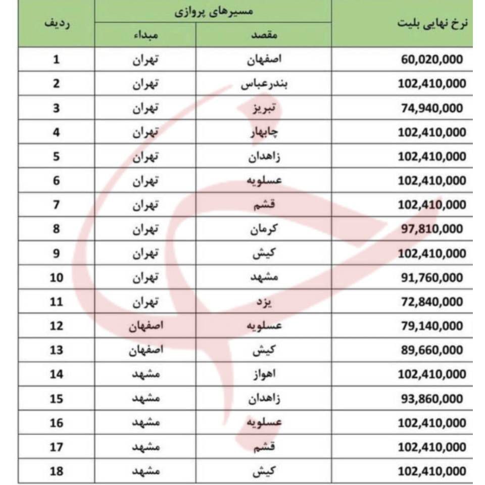 همچنین قیمت بلیت از سال گذشته تاکنون حدود ۳ برابر شده است. به عنوان نمونه پرواز تهران–مشهد از ۲۰ بهمن ۱۴۰۳ تا ۲۰ بهمن ۱۴۰۴ تقریباً ۲۹۹ درصد افزایش داشته و از ۲ میلیون و ۳۰۰ هزار تومان به حدود ۹ میلیون و ۱۷۶ هزار تومان رسیده است.