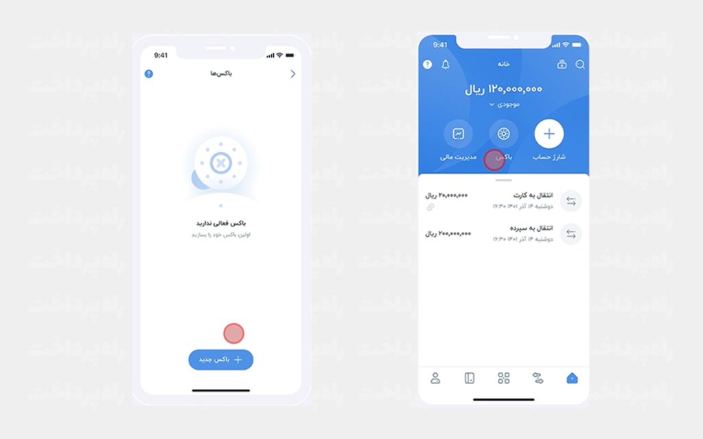 در ادامه، فرآیند وکالتی کردن حساب را در اپلیکیشن بلوبانک بهعنوان نمونه انجام میدهیم. برای انجام این کار، در مرحله اول متقاضی باید وارد اپلیکیشن بلوبانک شود. در گام بعد از منوی سمت راست گزینه «باکس» را انتخاب کرده و روی «ایجاد باکس جدید» بزند.