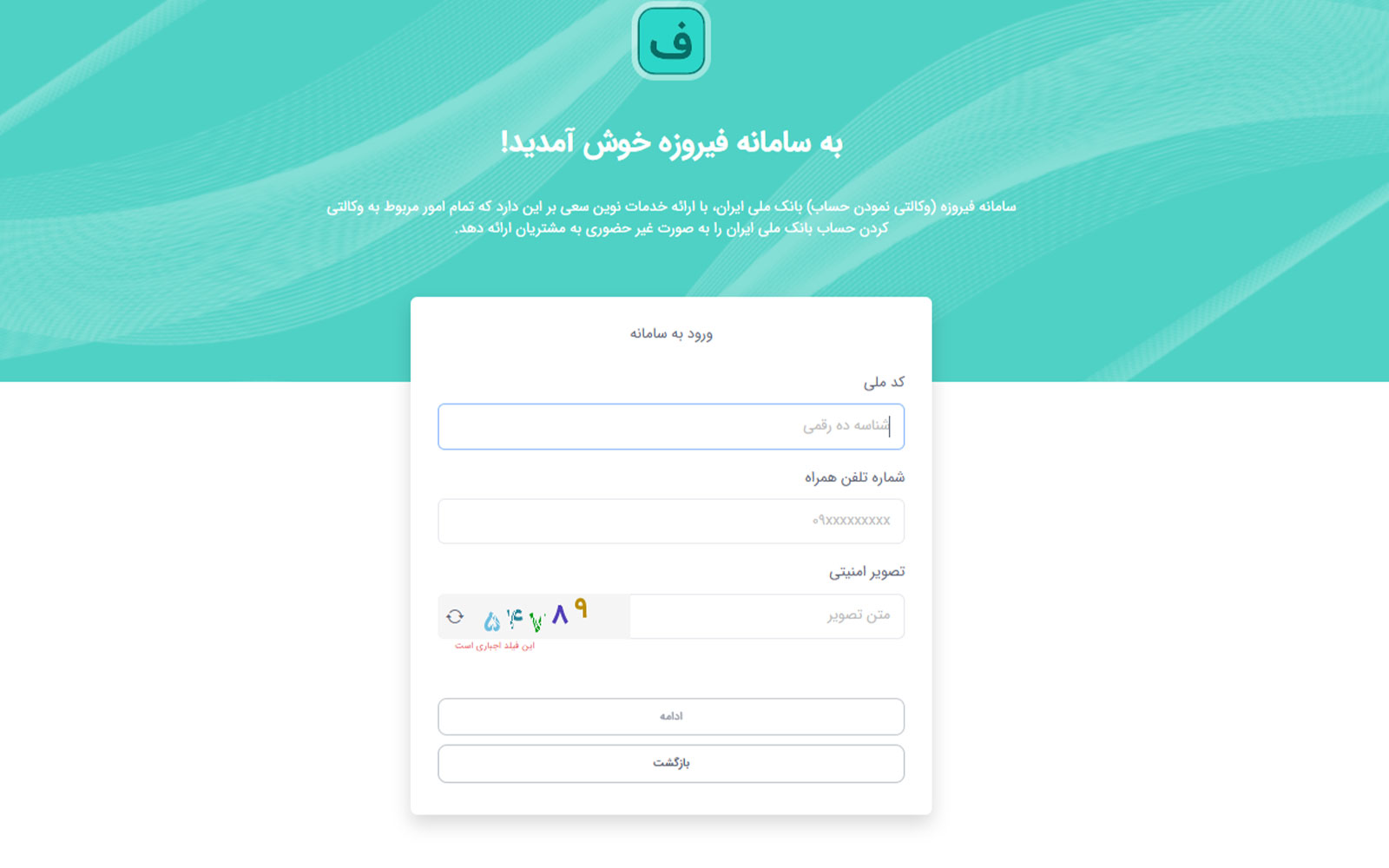 برای انجام این پروسه، در مرحله اول متقاضی باید وارد سامانه فیروزه بانک ملی شده و کد ملی و شماره تلفن همراه خود را ثبت کند.