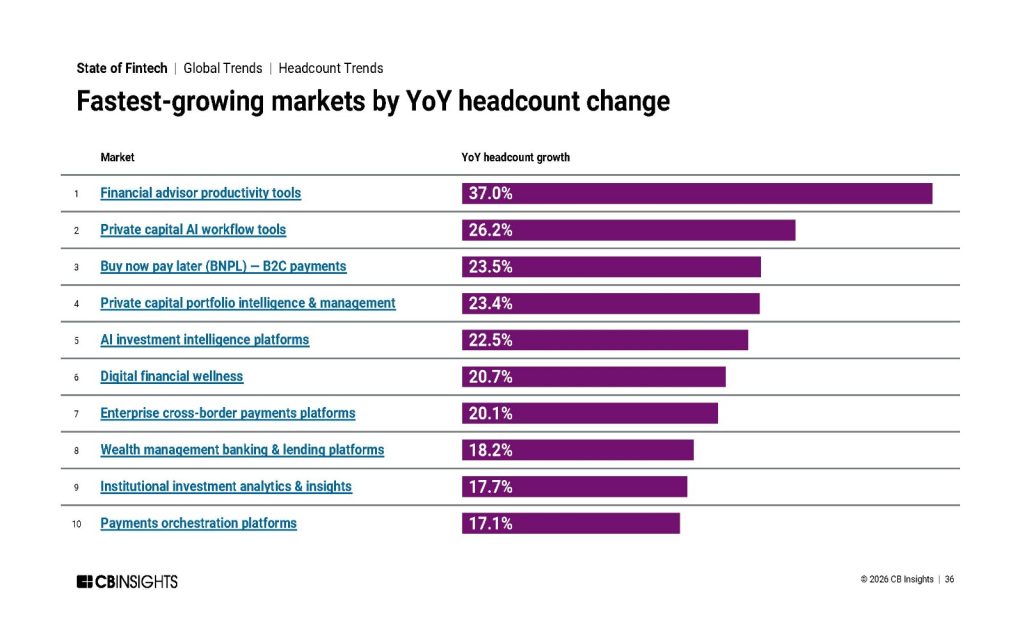 الگوی رشد نیروی انسانی نیز همسو با تغییرات گسترده‌تر بازار سرمایه، وارد مرحله‌ای جدید شده است. بررسی سریع‌ترین حوزه‌های رشد از نظر افزایش تعداد کارکنان نشان می‌دهد که تمرکز استخدام به‌طور فزاینده‌ای در بخش‌هایی قرار گرفته که به زیرساخت‌های مالی، بهره‌وری سرمایه و ابزارهای مبتنی بر هوش مصنوعی مرتبط هستند. در صدر این فهرست، ابزارهای افزایش بهره‌وری مشاوران مالی با رشد ۳۷ درصدی تعداد کارکنان قرار دارند. پس از آن، ابزارهای گردش‌کار هوش مصنوعی برای سرمایه خصوصی با رشد ۲۶.۲ درصد و خدمات بی‌ان‌پی‌ال در حوزه پرداخت مصرف‌کننده با رشد ۲۳.۵ درصد قرار گرفته‌اند.