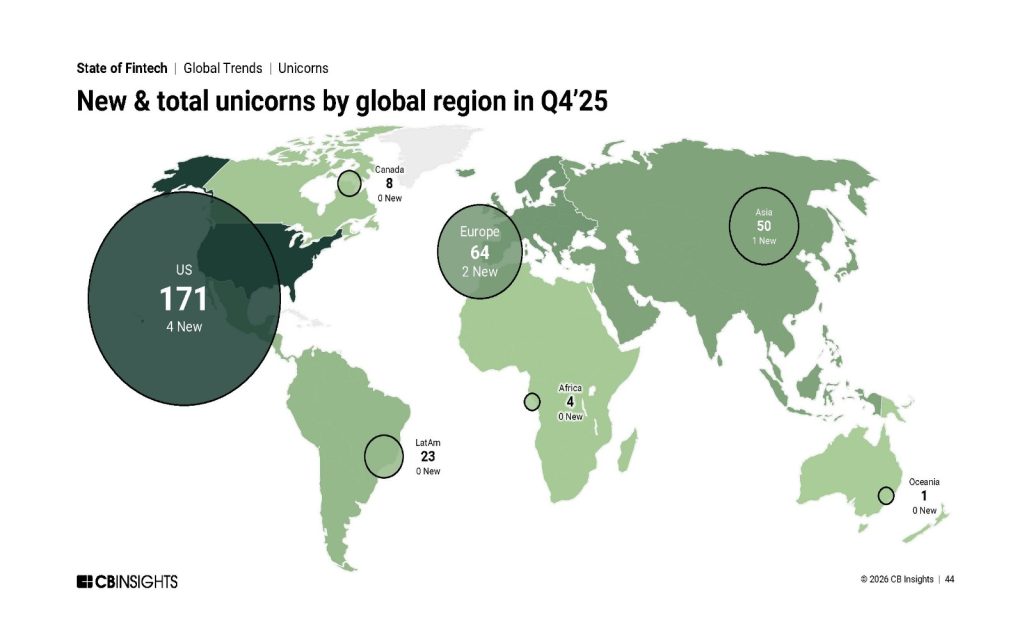 از نظر جغرافیایی نیز ایالات متحده همچنان بزرگ‌ترین بازار سرمایه‌گذاری فین‌تک باقی مانده است و تنها در فصل چهارم سال ۲۰۲۵، شرکت‌های فین‌تک آمریکایی توانستند ۷٬۷ میلیارد دلار سرمایه در قالب ۱۹ معامله بزرگ جذب کنند. این در حالی است که اروپا و آسیا نیز سهم قابل توجهی از سرمایه‌گذاری را به خود اختصاص داده‌اند و به ترتیب ۱٬۰ میلیارد دلار و ۰.۹ میلیارد دلار جذب سرمایه داشتند. با این حال، کاهش سرمایه‌گذاری در تمامی مناطق مشاهده شده است که نشان‌دهنده ماهیت جهانی چرخه اصلاح در صنعت فین‌تک است.