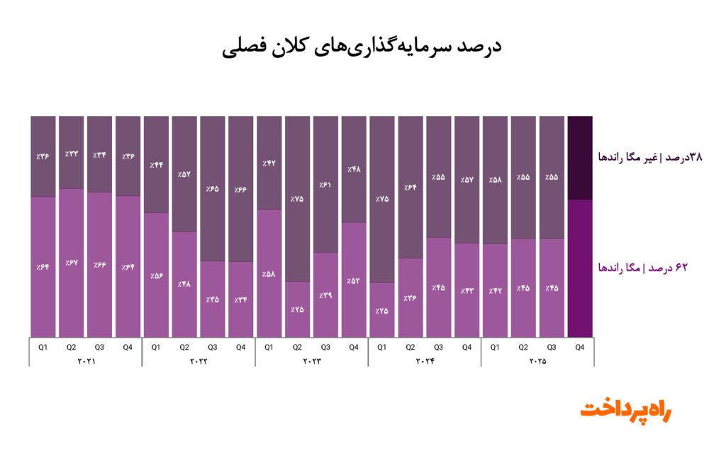 یکی از شاخص‌ترین نشانه‌های تغییر، تمرکز شدید سرمایه در تعداد محدودی از معاملات بزرگ است. در فصل چهارم سال ۲۰۲۵، ۶۳ درصد از کل سرمایه جذب‌شده تنها به ۲۹ معامله بزرگ یا «مگا راند» اختصاص یافت، در حالی که ۷۸۴ معامله دیگر برای سهم باقی‌مانده سرمایه رقابت کردند. این توزیع نامتوازن نشان می‌دهد که بازار دیگر به‌صورت گسترده از شرکت‌های متعدد حمایت نمی‌کند، بلکه سرمایه به‌طور فزاینده‌ای در اختیار شرکت‌هایی قرار می‌گیرد که توانایی جذب سرمایه‌های بزرگ را دارند.