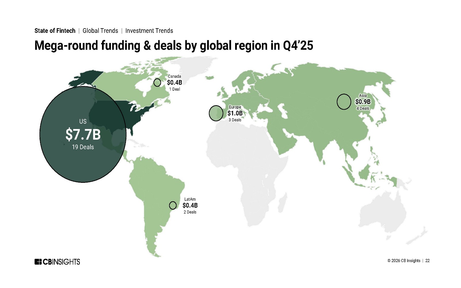 از نظر جغرافیایی نیز ایالات متحده همچنان بزرگ‌ترین بازار سرمایه‌گذاری فین‌تک باقی مانده است و تنها در فصل چهارم سال ۲۰۲۵، شرکت‌های فین‌تک آمریکایی توانستند ۷٬۷ میلیارد دلار سرمایه در قالب ۱۹ معامله بزرگ جذب کنند. این در حالی است که اروپا و آسیا نیز سهم قابل توجهی از سرمایه‌گذاری را به خود اختصاص داده‌اند و به ترتیب ۱٬۰ میلیارد دلار و ۰.۹ میلیارد دلار جذب سرمایه داشتند. با این حال، کاهش سرمایه‌گذاری در تمامی مناطق مشاهده شده است که نشان‌دهنده ماهیت جهانی چرخه اصلاح در صنعت فین‌تک است.