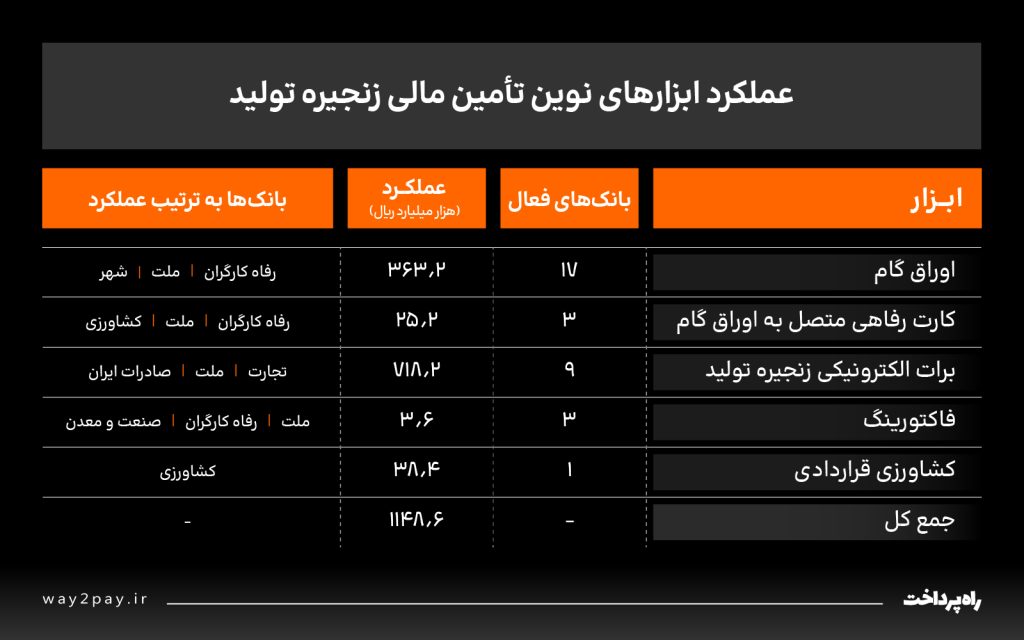 آمارها نشان میدهد توسعه ابزارهای نوین تأمین مالی زنجیره تولید در شبکه بانکی با هدف تسهیل تأمین مالی بنگاههای اقتصادی، افزایش کارایی نظام اعتباری و هدایت منابع مالی در زنجیره تولید در حال گسترش است و انتظار میرود با افزایش مشارکت بانکها و فعالان اقتصادی، سهم این ابزارها در تأمین مالی اقتصاد کشور بیش از پیش افزایش یابد.