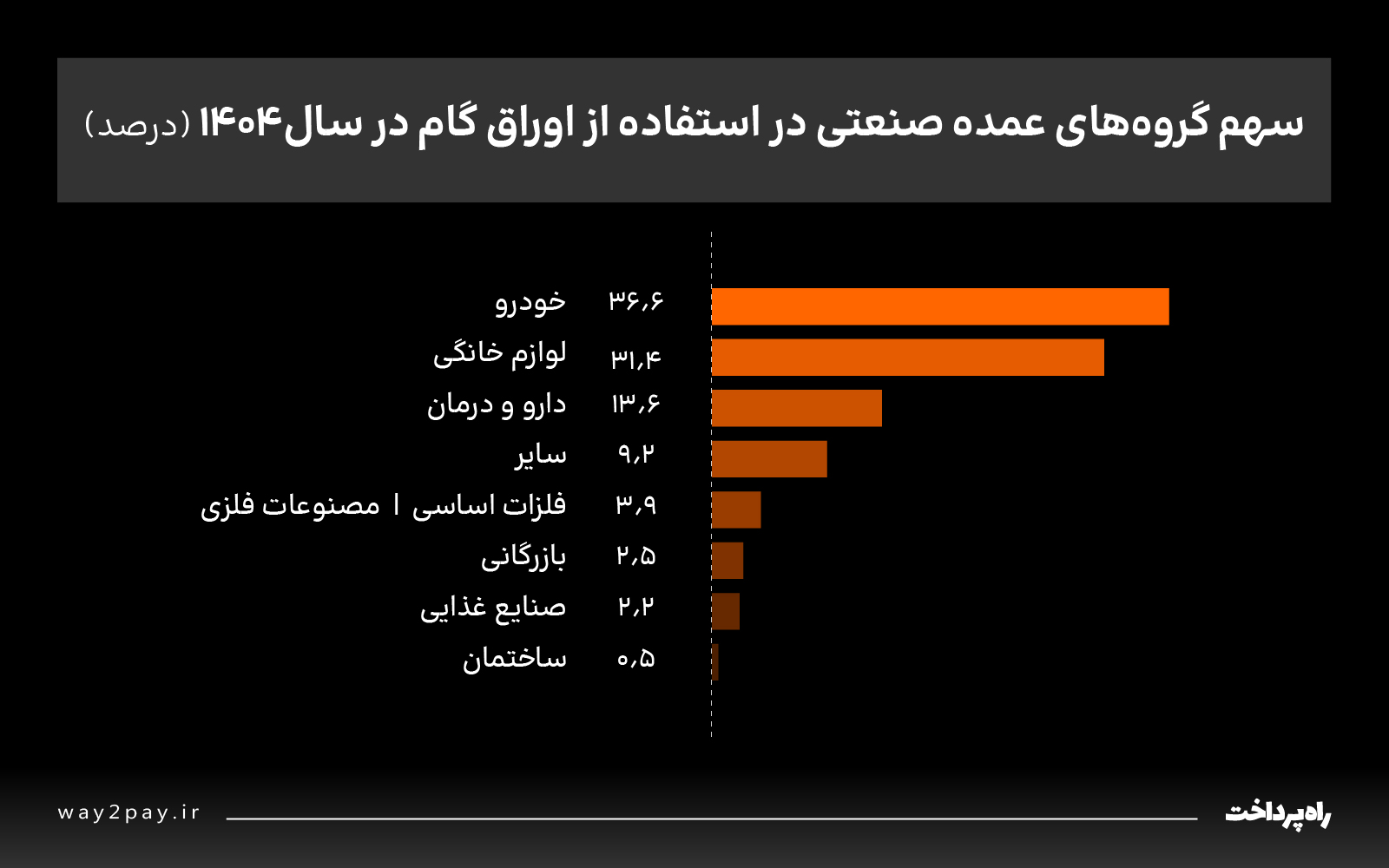 بررسی سهم گروههای صنعتی در استفاده از اوراق گام در سال ۱۴۰۴ نشان میدهد صنعت خودرو با سهم ۳۶.۶ درصد بیشترین استفاده را از این ابزار تأمین مالی داشته است. پس از آن، صنایع لوازم خانگی با ۳۱.۴ درصد و حوزه دارو و درمان با ۱۳.۶ درصد قرار دارند؛ بهطوریکه این سه بخش در مجموع حدود ۸۰ درصد از منابع اوراق گام را به خود اختصاص دادهاند و بیشترین تمرکز تأمین مالی در این حوزهها بوده است.
