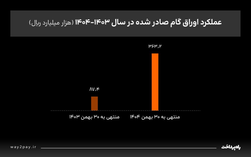 بر اساس آمار منتشرشده، مجموع تأمین مالی انجامشده از طریق اوراق گام صادره توسط ۱۷ بانک تا پایان بهمنماه ۱۴۰۴ به ۳۶۳٬۲ هزار میلیارد ریال رسیده که نسبت به مدت مشابه سال قبل با ثبت رقم ۸۷٬۴ هزار میلیارد ریال رشد قابلتوجهی را نشان میدهد. در این بخش، بانکهای رفاه کارگران، ملت و شهر بیشترین عملکرد را داشتهاند.