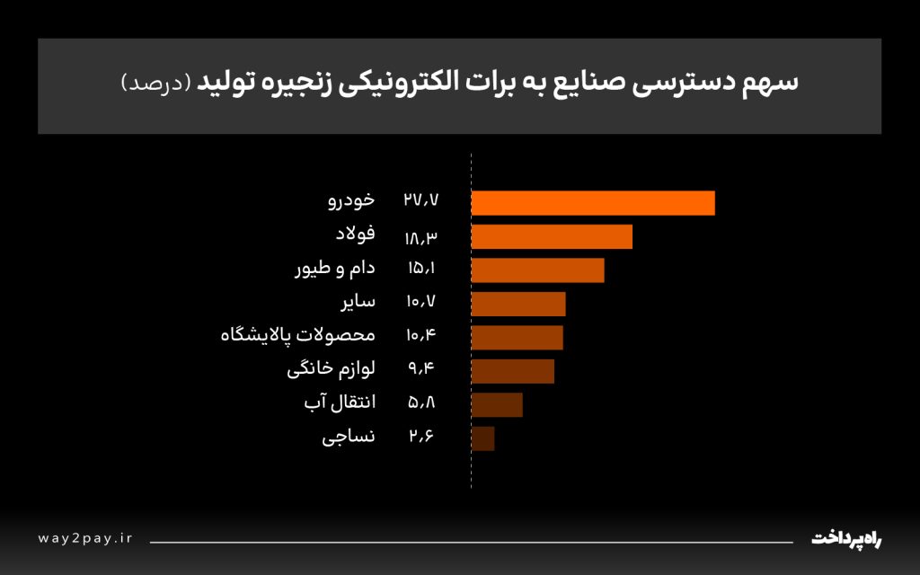 بررسی سهم صنایع از برات الکترونیکی زنجیره تولید در سال ۱۴۰۴ نشان میدهد صنعت خودرو با سهم ۲۷.۷ درصد بیشترین استفاده را از این ابزار داشته است. پس از آن صنایع فولاد با ۱۸.۳ درصد و دام و طیور با ۱۵.۱ درصد قرار دارند؛ بهگونهای که این سه بخش در مجموع حدود ۶۱ درصد از تأمین مالی انجامشده از طریق برات الکترونیکی را به خود اختصاص دادهاند.